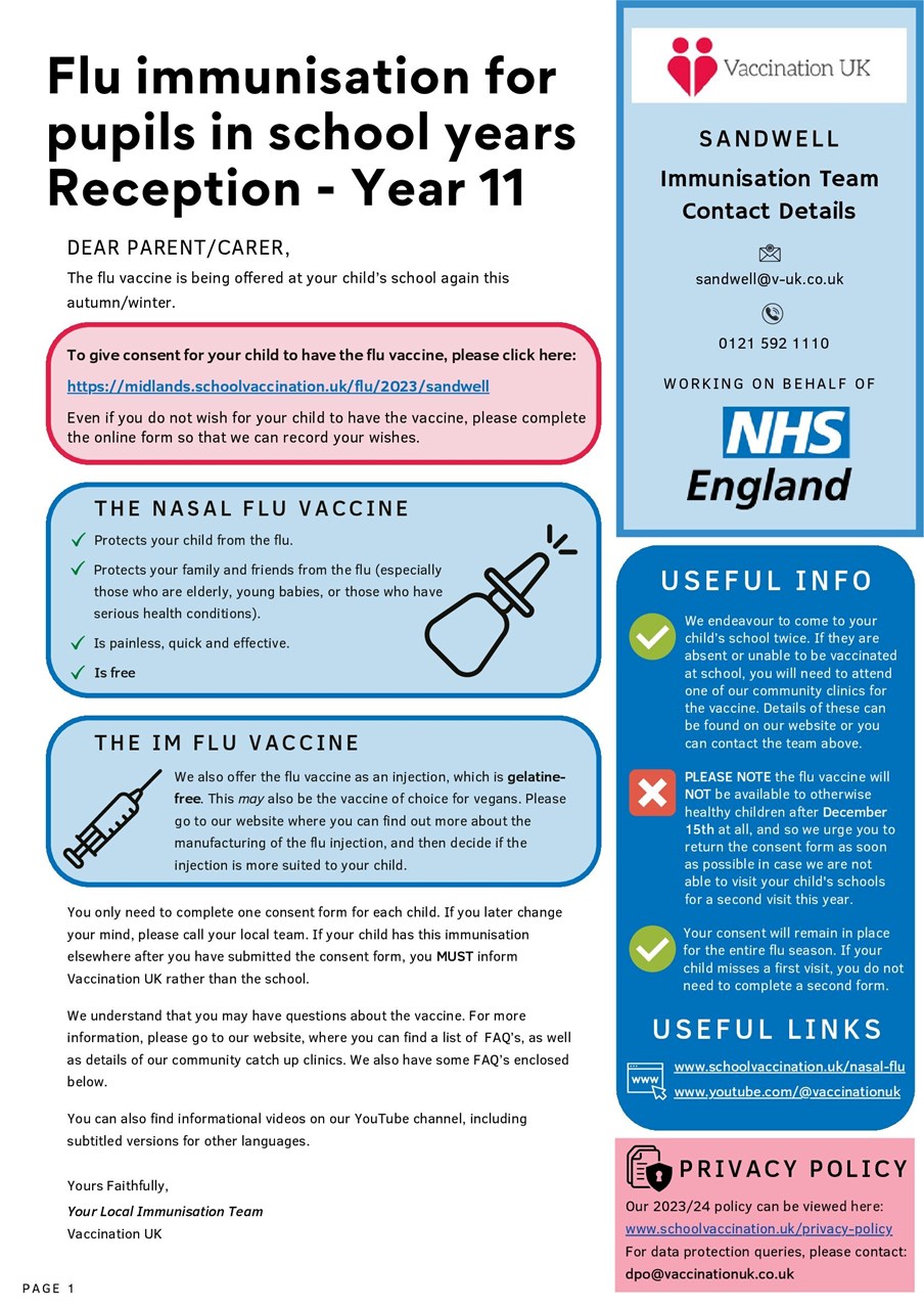 The Flu Vaccination team will be coming into school on Friday 6th October. The link to accept/decline will be closing on Thursday 28th September at midnight. It is important that you use the link before Thursday to complete the online form. Thank you.