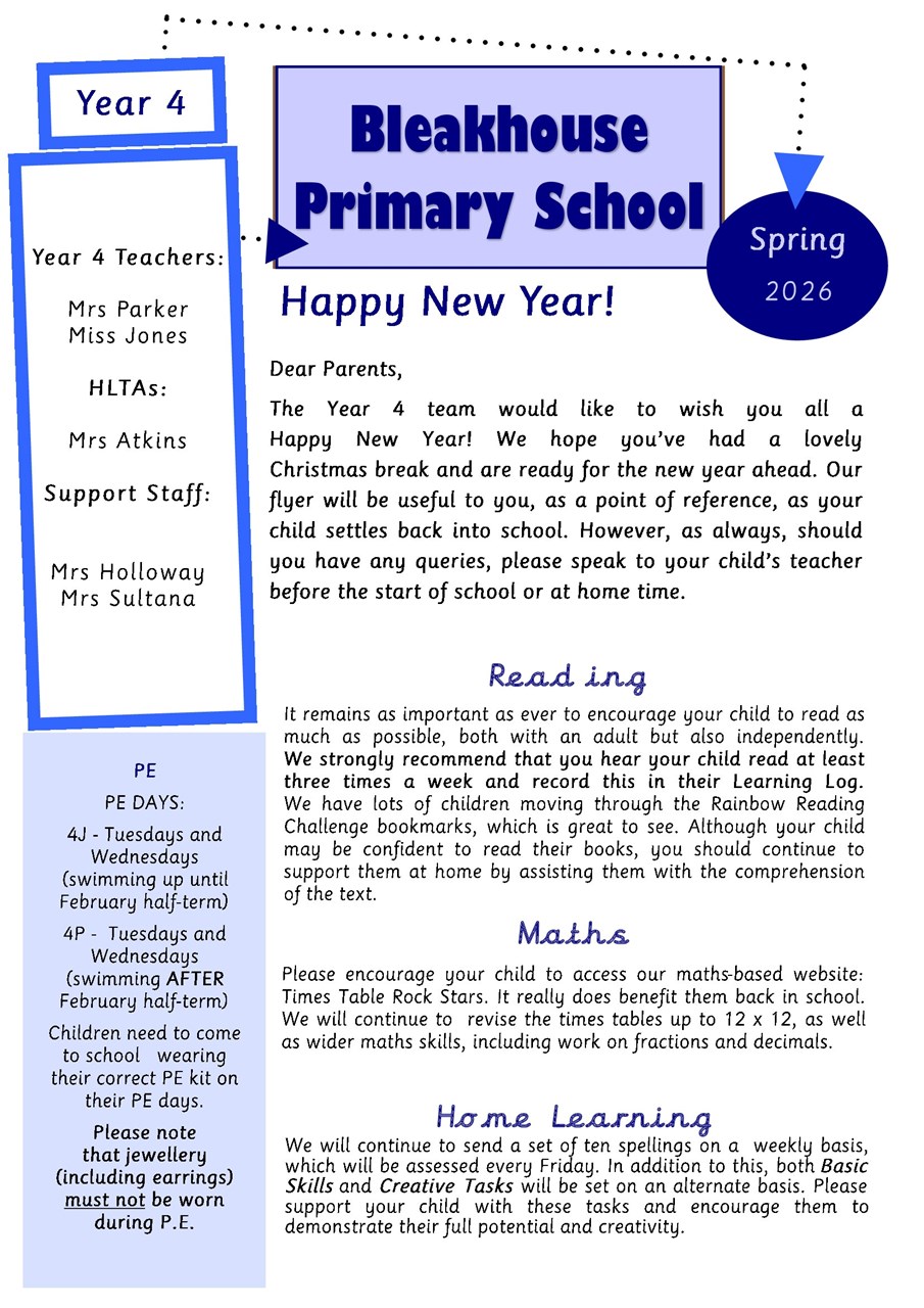 Year 4 will have PE on Tuesdays and Wednesdays.